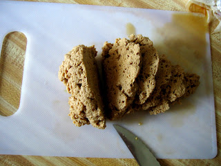 You'll likely need to buy extra soy sauce; it ends up being quite a bit. Also, make sure you actually have vital wheat gluten flour; it's not the same as whole-wheat flour. Vital wheat gluten flour is essentially just the gluten part of wheat flour. It can be made with only whole-wheat flour, washing the flour dough until all of the starch dissolves. Vegan Internet blogs made this sound risky, so I decided to just buy the vital wheat gluten flour. Whole Foods had it, Bob's Red Mill brand. Nutritional Yeast Flakes were found at Willy Street Co-Op in bulk, which was nice and cheap. I used water, not vegetable broth. If you decided to use it let me know how it turns out! I decided all the soy sauce would be salty enough.